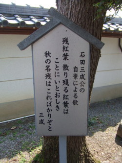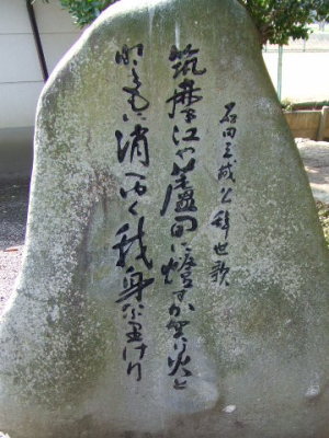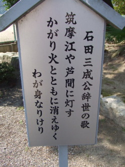 石田神社 屋敷跡から自転車で5分位 正直に言います。 場所とか何が有ったとか、どんな雰囲気だったかとか そういう事はものすごく覚えてます。 でもここで何の話したかは全く覚えてません・・・(ノ∀T) 旅行記失格ですね、そうですね。 2年間放置してた時点でそれははっきりと自覚してます(ノ∀T) ただいえるのは、ものっっっすごくひっそりしてました。 で、↓辞世の句の碑を見て俺もひっそり沈みました・・・。 |