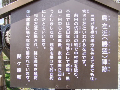 | 島左近陣跡と案内板 ここから左近が「かかれ〜かかれ〜!!」って出陣していったのですね。(何だろう、この書き方だと緊迫感がまったくない・・・) 左近の旗にテンション上がりかけましたが、何か色々考えたらションボリです。 人目がなければ旗に抱きつきたい位でした・・・(病気ですから) |