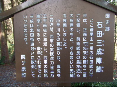 石田三成陣跡と案内板 関ヶ原町を一望できます。 ちょっとした休憩所と、ぐるりの説明がされた案内板がありました。 静かに風が吹いていて、ちょっと切ないです。 |