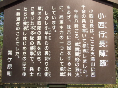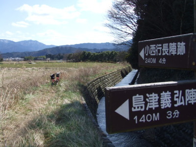 小西行長陣跡 そんなこんなで行き着いた小西の陣跡。 周りは、風が吹くと黄色い粉が飛ぶ位の花粉をつけた杉の木だらけで、 花粉症じゃなくて良かったとか思ったり思わなかったり。 |